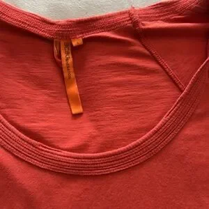 Nice peachy-orange colored top with details to make it above basic. Little bit looser fit too.