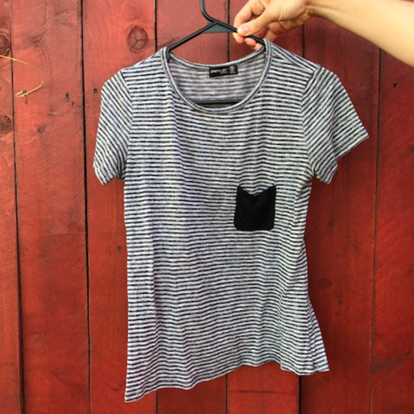 This is a cute basic t-shirt with a black pocket. I like to wear this with high waisted black jeans and cute black heel boots!