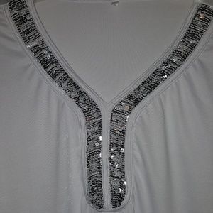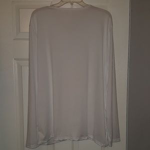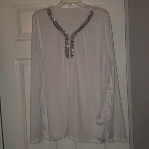 All white with silver detail around n down neckline. As pictured. Never worn. Says 6X but more like a 2X.