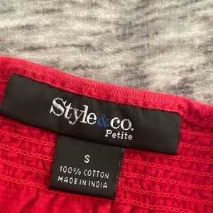 Cute blouse with white stitch detail. Bottom has a stretchy waist band so you can adjust where the blouse sits on hips/waist. Worn a few times, still in good condition. Great for layering or work attire! Business casual