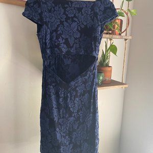 This dress is so cute and comfortable, could be styled up or down. Stretch denim fabric with a lovely floral brocade pattern. Features a sexy back cutout, but you can absolutely wear with a bra and straps won't show.