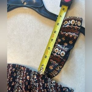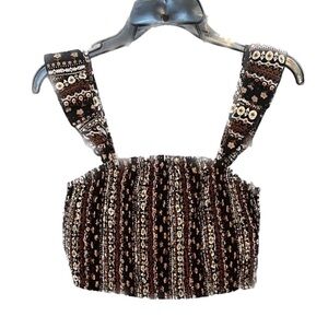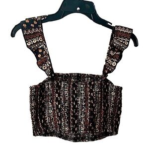 This is a ruched crop top (estimate sz S/M) it is a black, brown rust, and white print. It has ruffle sleeves.