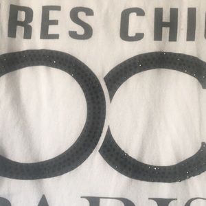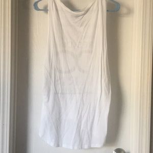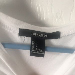 White designed tee shirt with sleeves cut out . Cute with a Bradley’s under . Looks cute long just like so, tucked in or with a knot tie on front or back. Only worn once fits like a medium