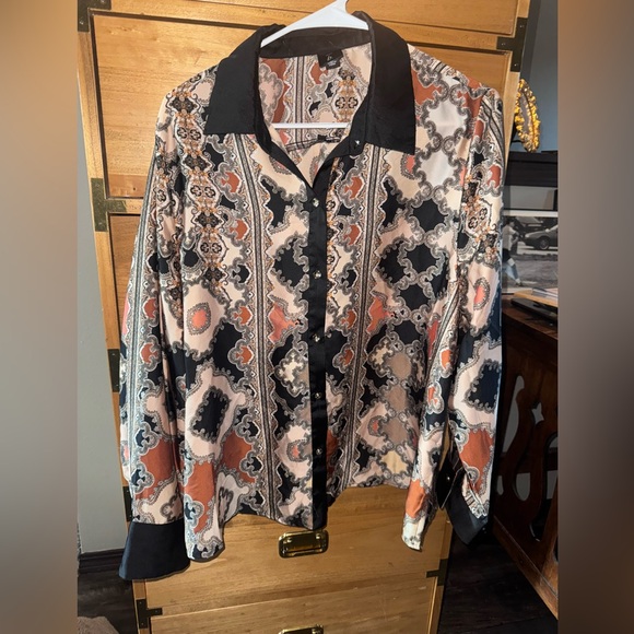 Elevate your wardrobe with this stylish shirt featuring a bold black and orange pattern. Perfect for any occasion.