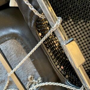 Cute clutch or shoulder bag in shiny black with a metallic strap