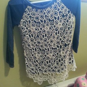 Navy blue thin sweatshirt material with crochet design in the front. Wore once and washed once in like new condition. It's just a little snug now on me.