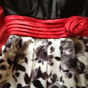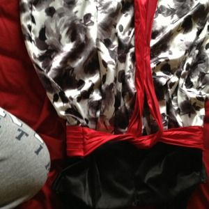 Black and white designed bottom. Red ribbon under bust whith rose and ribbon tie around back and black bust and straps