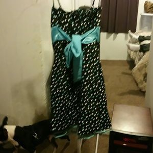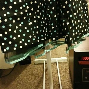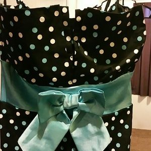 Blue and white polka-dot with blue ribbon in front and tie in the back...worn one no stains or tears