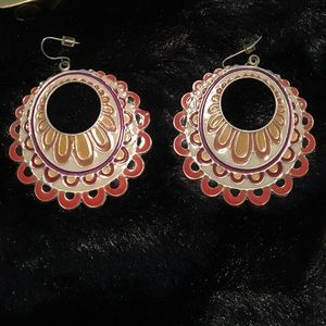 Three adorable pairs of earrings. All gold accented, there are two small tear drop shapes, one burgundy, and one orange, and a larger tear drop shape scented with cream, burgundy, and orange. Very fun and can be easily dressed up or down!