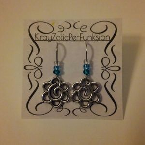 Tibetan silver flower charms with swirled middle and blue accent seed beads. On silver tone hooks.