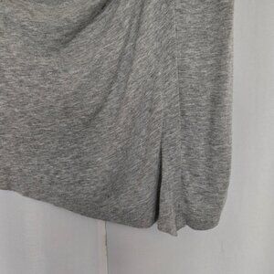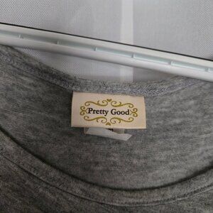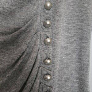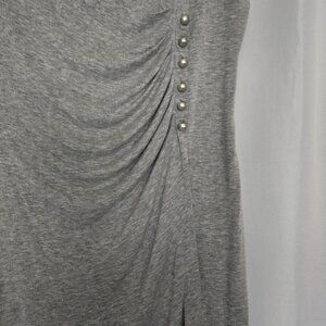 Cute gray high low short sleeve top. Angled in the front. White pearly look buttons on the left side. 16" pit to pit. 23" from back of neck to back hem.