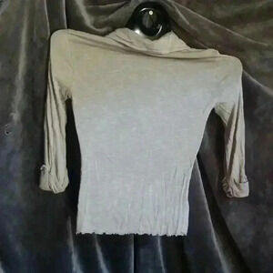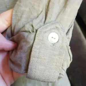 Adorable gray shirt. Sleeves about 3/4 and cuffed as shown in the pic. Has adorable little ruffles at the bottom and buttons down. In great shape. Just needs to be ironed.