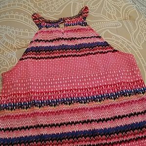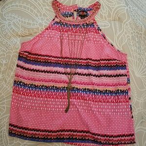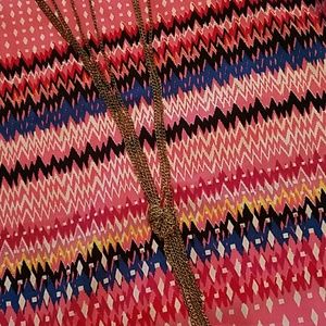 Brand is IKY Me, size Large. About 20 inches across from armpit to armpit. About 14.5 inches long from armpit to hem in front, slightly longer in back. Very large arm openings which may warrant a cardigan or camisole. Primarily bright bubble gum pink with splashes of red, fuschia, black, blue, yellow and white. Chain at neck is not removeable. Hanging chains can be removed. All chains are tarnished and need some TLC. Otherwise in great condition. 100% polyester. Machine wash. Smoke free home.