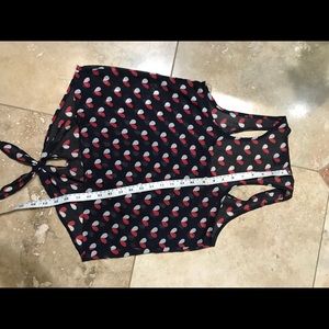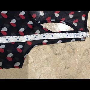Cute heart patterned blouse. Navy blue with red and white hearts. Front Tie detail. Pair with tights. Sheer. Can be worn as is or with tank top inside. Like new as work only once. No defects. Measurements on photos. Pet and smoke free home.