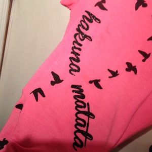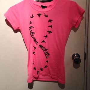 Hot pink shirt with infinity bird sign saying Hakuna Matata from The Lion King. Sold individually as six dollars or free with any other purchase.