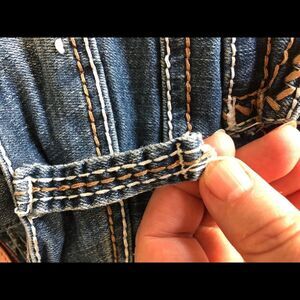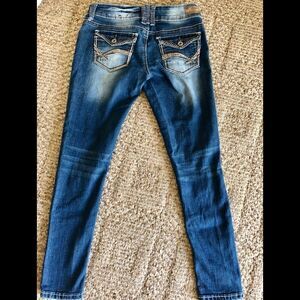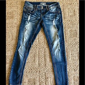 Cute skinny jeans by Reign in size junior 5. Lots of distressed areas on the front. One of the belt loops is loose. Inseam is 27” and rise 7”.