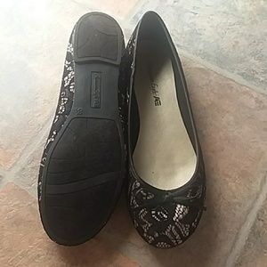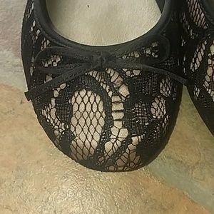 Black lace flats, little bow on top, with a cream/peachy color undertone, in great condition