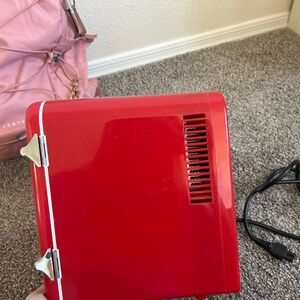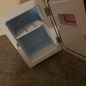 Mini fridge with silver handle, you can put snacks, makeup, skincare, etc to keep cool in your room. comes with handle and black cord.