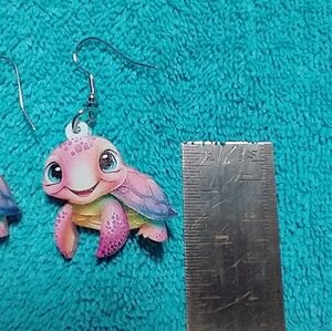 Cute multicolor colorful smiling turtle wire dangle earrings blue pink green