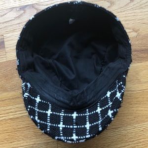 Black and white acrylic hat with brim. Cute, ‘skater-esq’ style.