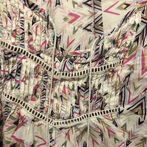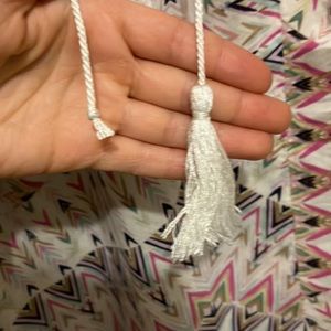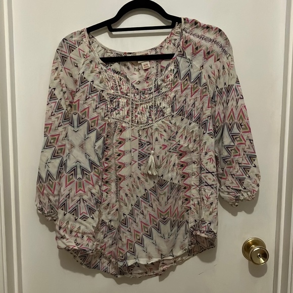 Loose flowy long sleeve blouse. Elastic wrists. Pleated detail on front. Missing one tassel.