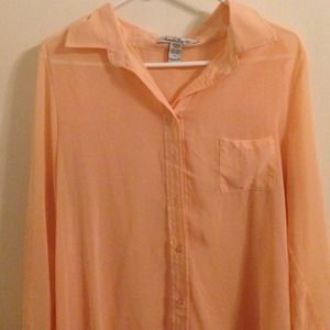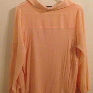Really cute peach colored blouse only worn once. The front and sleeves are sheer/see through while the back is not. Only worn once.