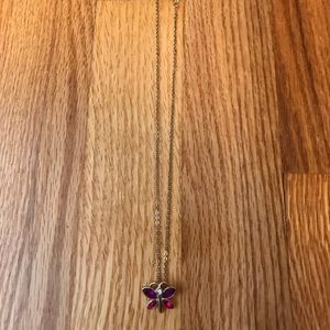 This is an adorable little necklace. It’s long enough to almost touch the sternum. Chain can be changed. It’s a necklace little girls adore! Butterfly box included with purchase 😊