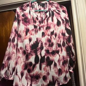 Lightweight long sleeve purple and white blouse. It has a Vneck that is conservative but it’s fashionable too. Could wear to work or out on the town.