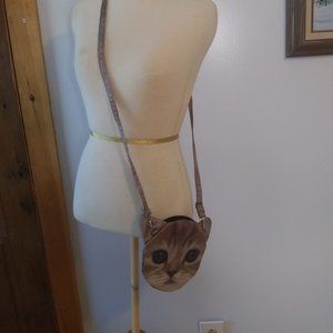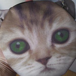 Cute realistic cat face cross body cloth bag . Same cute face on both sides beautiful green eyes. Nothing fancy just a fun bag. Perhaps part of a cat "woman costume. Measurements : From top of adjustable strap ( the longest length) ~29". The cat face part ~9" x ~7" please see above photos of what was measured. Questions are always welcome . The mannequin is a small so a cross body on some and a shoulder bag on others