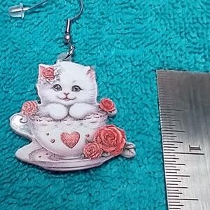 Cute red white flower floral heart kitten in cup cat wire dangle earrings