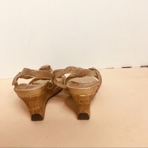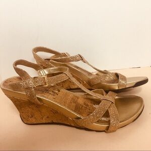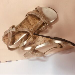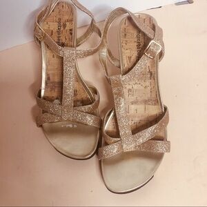 Cute sandals perfect for the spring and summer in Rose gold glitter with gold buckle around ankle non-skid bottoms 3 1/2 inch heel rounded toe Perfect to add a little glitter to your Spring night