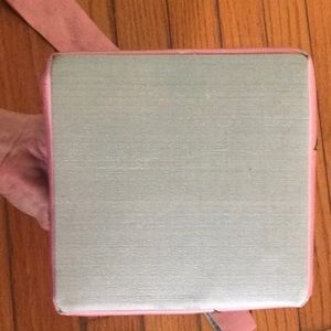 Pink and mint hand embroidered. Satin fabric with Velcro closure . Pink inside with a tiny pocket and mint bottom. So pretty and hardly used!