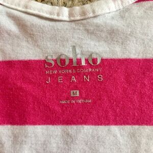 Pink striped shirt low cut in front and back. Little elastic in the waist. 95% cotton and 5% spandex.