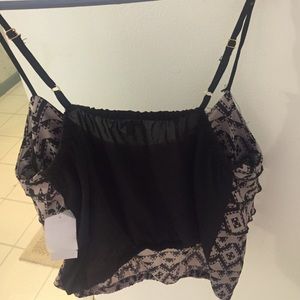 Its a really cute pink and black crop top with ruffles on the top. Super flexible on prices.