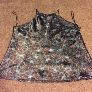 Silky chocolate with turquoise flowers! This blouse can totally dress up a pair of jeans. Has single button closure in back. XL size. I cut the tags out because they were itchy but in fabulous condition!