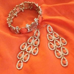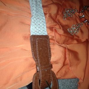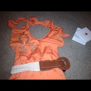 Orange small dress with a flared top. It ties on the neck. Comes with brown belt around the waist. And flares at the bottom above the knees. A pair of matching dangling earrings w/ matching bracelet.! Can negotiate