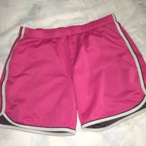 Long. Semi- stretchy. Pink with white trim sporty shorts. Long. XL but fits smaller