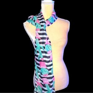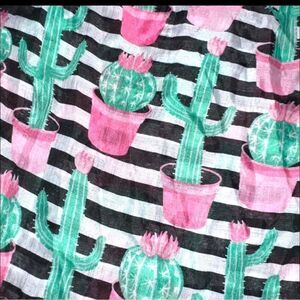 This is so cute! Black stripes on semi sheer white scarf, has cute greenish cactus design!! Around 63” long and 14” wide