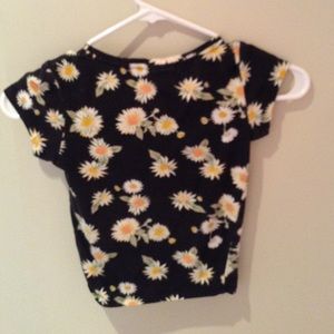 black with daisy designs on it. tighter at the bottom and sleeves. fits to show curves.