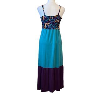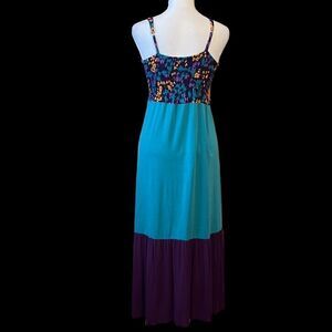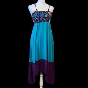 Cute szS purple and turquoise solid and print elastic bodice high low hem EUC