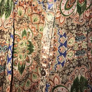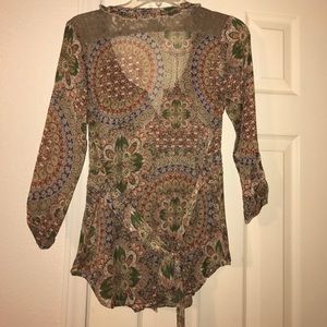 3/4 Sleeve length blouse with different colored designs on it. Great condition barely worn! Missing one button (as pictured) but still functions with buttoning up.