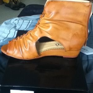 Sandal is tan peek boo toe on each side is Out and it zip on the back never worn