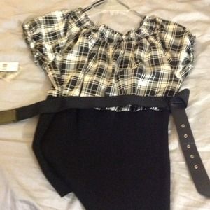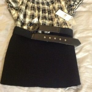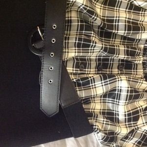 Black bottom, top checkered black and white, belt, buttons, never worn size large