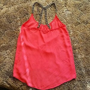 Says xs but fits more like a med/LG. Super cute coral flowy top with with chain/leather straps