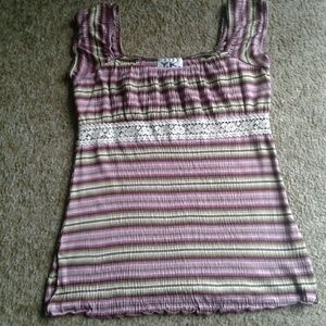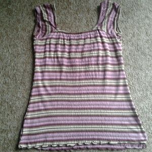 Short sleeve top...looks like a tank top, but sleeves are just real short. Very soft material. Size is unknown, but it's either a M or L. Only worn once very long ago, so still in great condition!