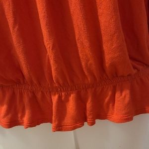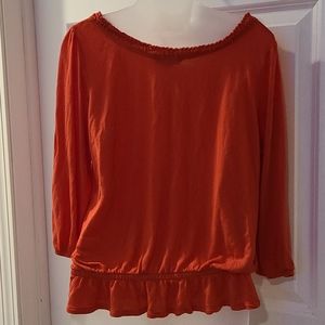Such a comfy top goes well on any body shape hides what u want it to and still looks flattering in great condition. Color more of burnt orange 🍊