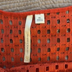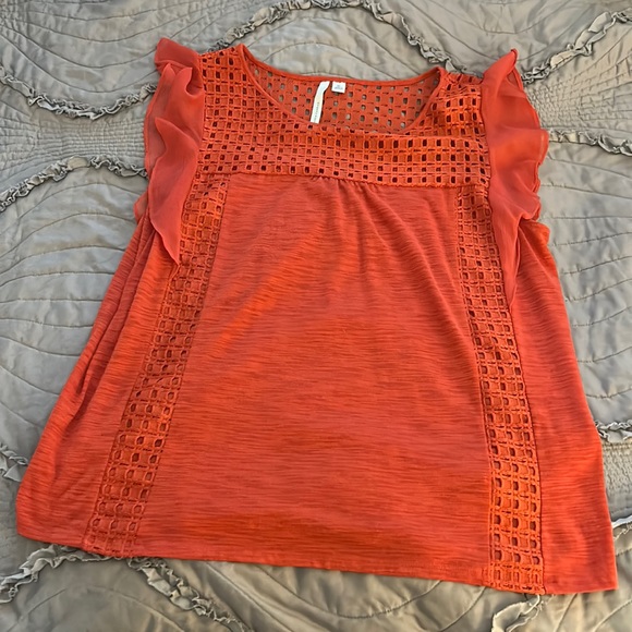 Super cute burnt orange top! Sleeveless but ruffles hang over the shoulder a bit. Used, only worn a few times