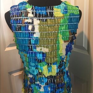 Very cute colorful top with moving parts , great for dancing. Made by R&K size 12 Petite. 95% Polyester 5% Spandex.