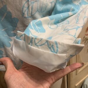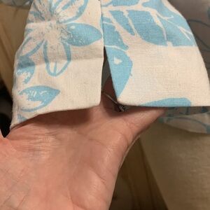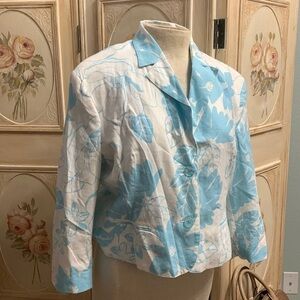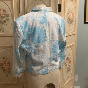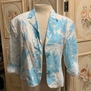 Cute waist line jacket. It is a cotton linen linen blend fully lined to button closure, tailored in sides and chest line and back. Small faux pockets at waist line comfortable sleeves with notch in sleeve sleeve is a three-quarter inch sleeve pair with white pants or capris. Padded shoulders. Tag was removed for comfort. Must read the measurements for the size but I normally wear a medium.