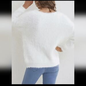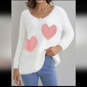 NEW! Cute white fuzzy comfy pink heart beaded sweater Size: small